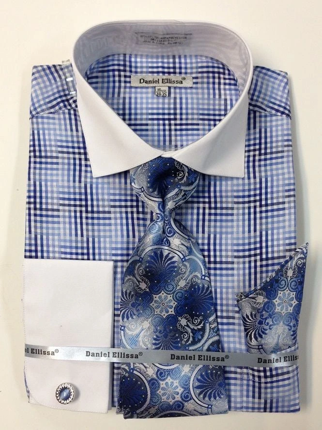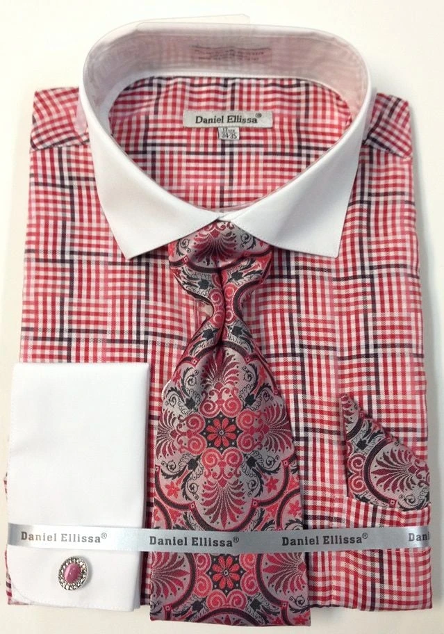 Daniel Ellissa Men’s French Cuff Dress Shirt Set – Geometric Plaid